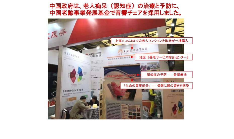 2018年 第8回上海国際健康産業博覧会(12月12日~14日)に上海市政府は、『諸行無常の鐘の響き ゼロ磁場 音響免疫療法』の音響チェアを出展しました。